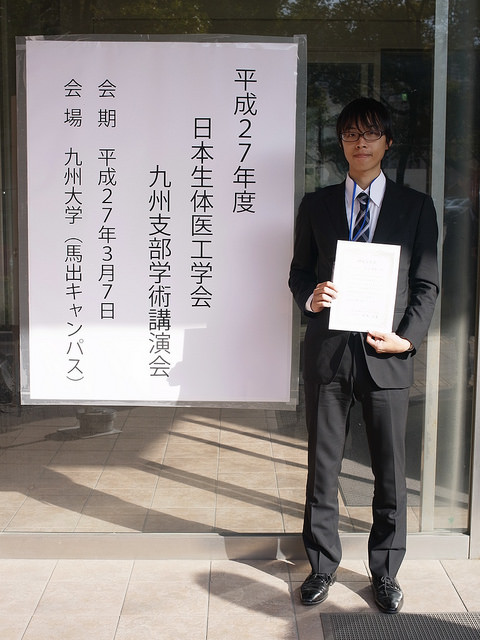 学会発表で受賞:平成27年度 日本生体医工学会 九州支部 学術講演会 2015年3月10日2021年7月1日 学会/研究会発表 2015年3月7日(土)に九州大学病院キャンパスにて開催された「平成27年度 日本生体医工学会 九州支部 学術講演会」において、専攻科2年生 清田麻寛君が口頭発表を行いました。 清田君の発表「色覚異常者のためのウェブコンテンツカラーコンバータの作成と評価」は審査委員の高い評価を得て、研究奨励賞を受賞しました。