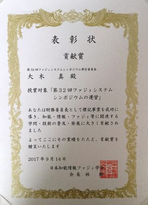 大木教員が日本知能情報ファジィ学会 学会賞「貢献賞」を受賞しました 2017年10月5日2021年7月1日 教員の活動 本学科 准教授 大木真 が日本知能情報ファジィ学会から学会賞「貢献賞」を受賞しました。2017年9月13-15日に開催された第33回ファジィシステムシンポジウム(山形大学米沢キャンパス)内で表彰式が執り行われました。