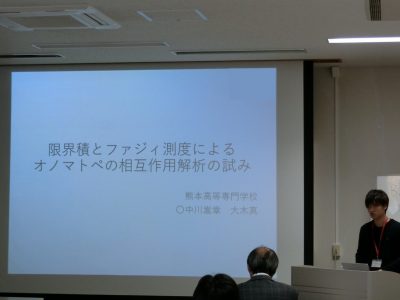 2018年12月1日、第20回日本知能情報ファジィ学会九州支部学術講演会が鹿児島大学にて開催されました。 この学術講演会において、本学科5年生の紫垣龍征君と堀川賢吾君、専攻科1年生の入口純太君、中川嵩章君、松木大君が口頭発表を行いました。教員と大学院生が発表する中に混ざり、本学の学生達は堂々と発表を行いました。